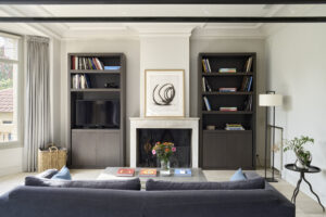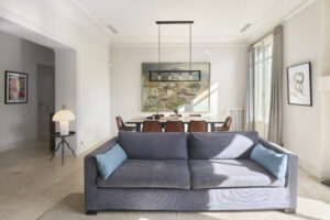 • Un espace de vie convivial avec un salon lumineux, cheminée et télévision, s’ouvrant sur deux balcons, avec vue sur le jardin, invitant à la détente.