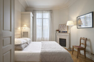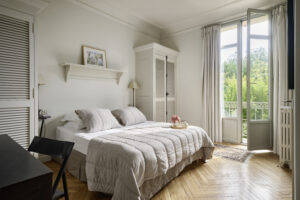 • Chambre 2 : Une suite lumineuse avec un lit queen size (160 cm), des placards, une salle d’eau, des toilettes et un accès au balcon.